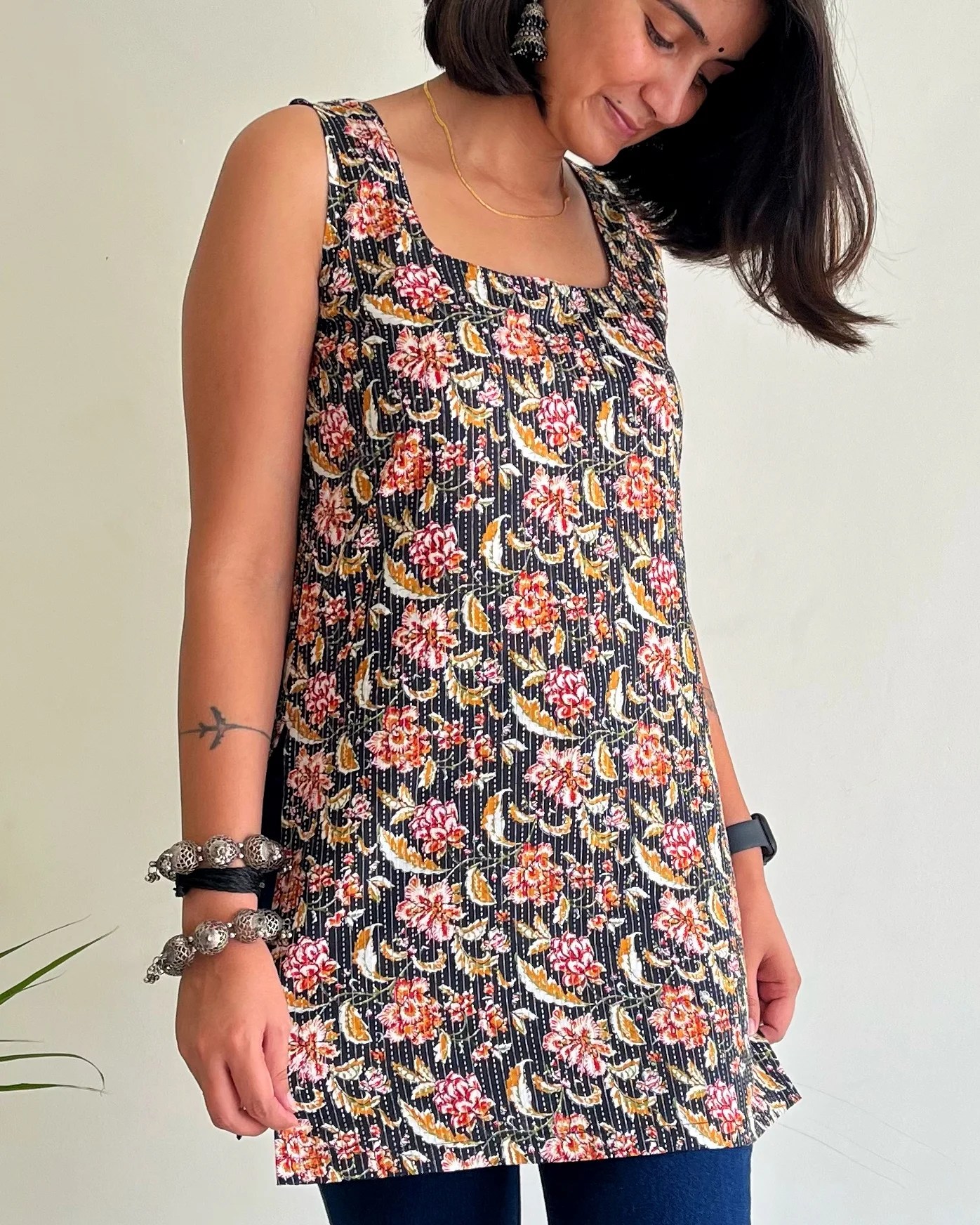 This Handcrafted Short kurti features a beautiful floral hand-block print, sleeveless, and a flattering U-neck design. Made from lightweight, breathable cotton, it offers both comfort and elegance, making it a versatile addition to your wardrobe.