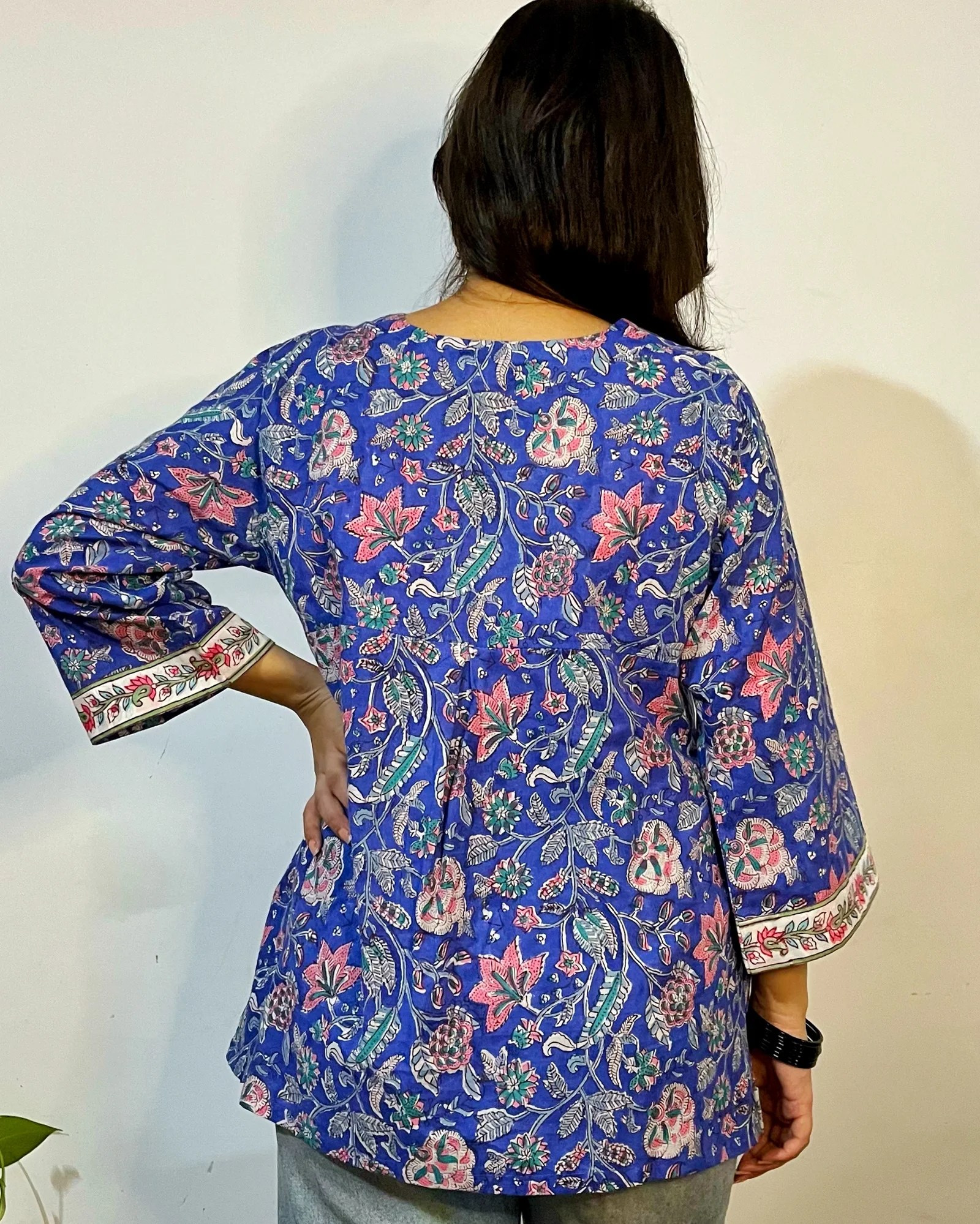This Handcrafted Short kurti features a beautiful floral hand-block print, 3/4th sleeves, and a flattering V-neck design. Made from lightweight, breathable cotton, it offers both comfort and elegance, making it a versatile addition to your wardrobe.