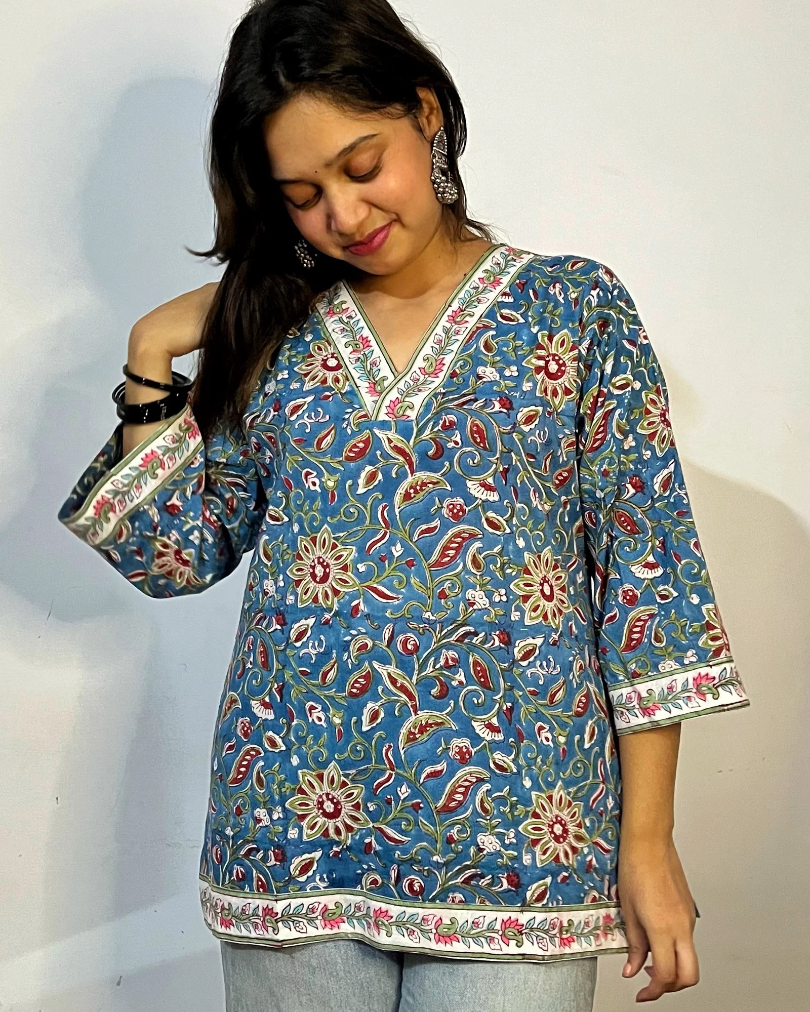 This Handcrafted Short kurti features a beautiful floral hand-block print, 3/4th sleeves, and a flattering V-neck design. Made from lightweight, breathable cotton, it offers both comfort and elegance, making it a versatile addition to your wardrobe.