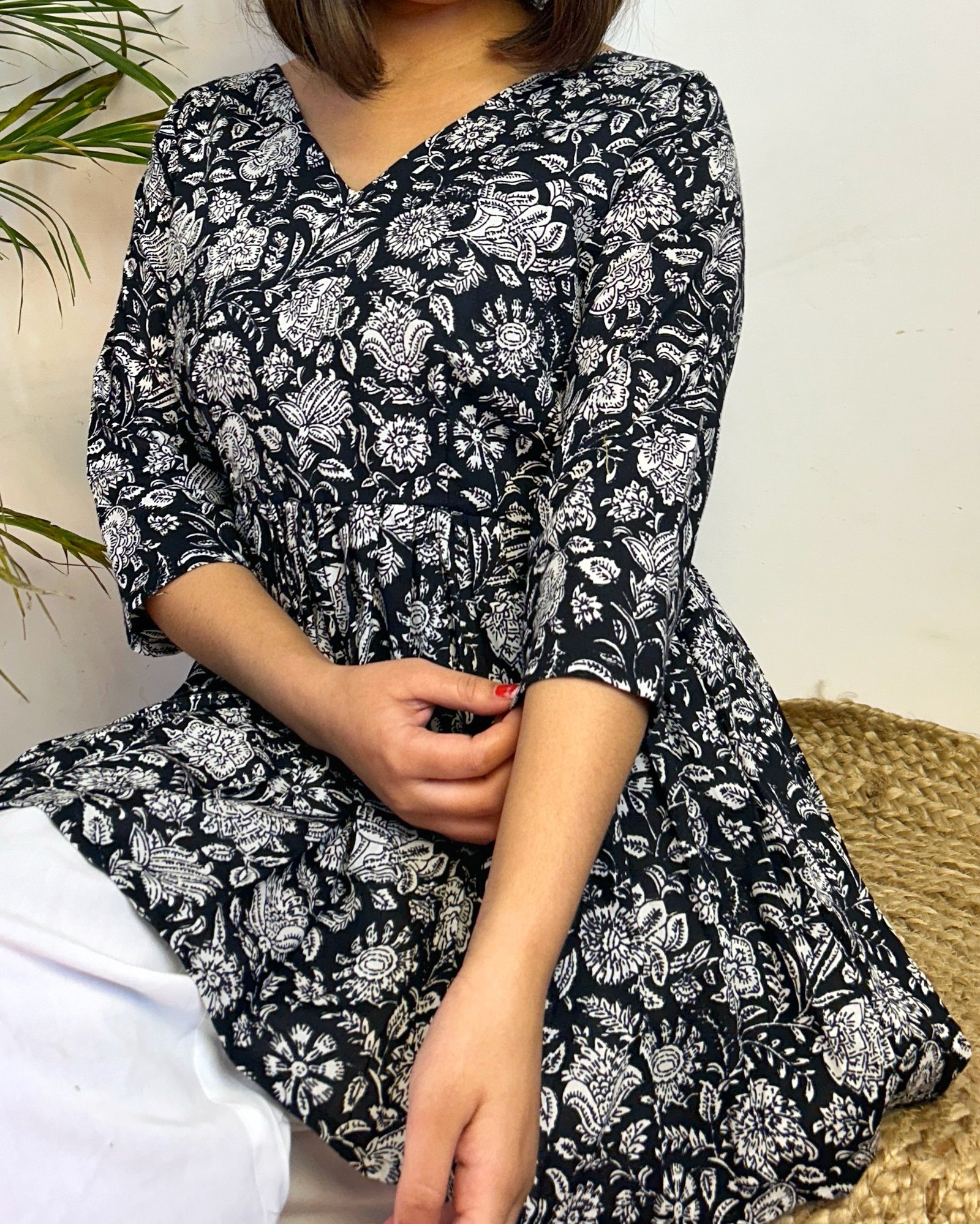 “Handcrafted from soft, breathable hand-screen printed fabric, this 25-28-inch top offers both comfort and style. The fabric is lightweight yet durable, perfect for customizing with your choice of neck and sleeve designs, allowing you to create a piece that’s truly yours.”