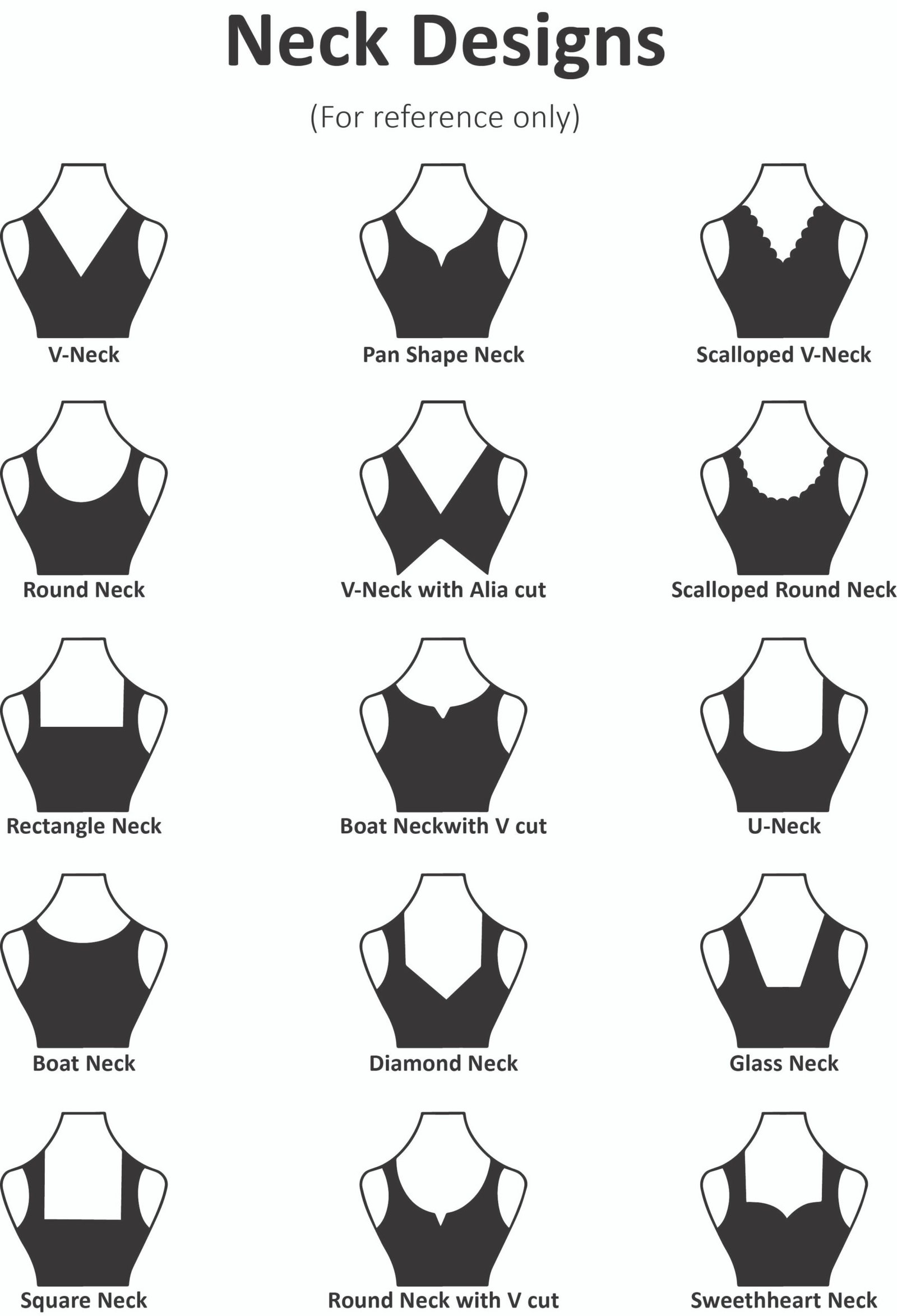 | NECK | Round Neck, Round Neck with V cut, Boat Neck, Boat Neck with V neck, Pan Shape Neck, Square neck, Rectangle Neck, Diamond Neck, Sweetheart Neck, V Neck, V Neck with Alia cut, U Neck, Glass Neck, Scalloped-V Neck (+₹100.00), Scalloped Round Neck (+₹100.00) |