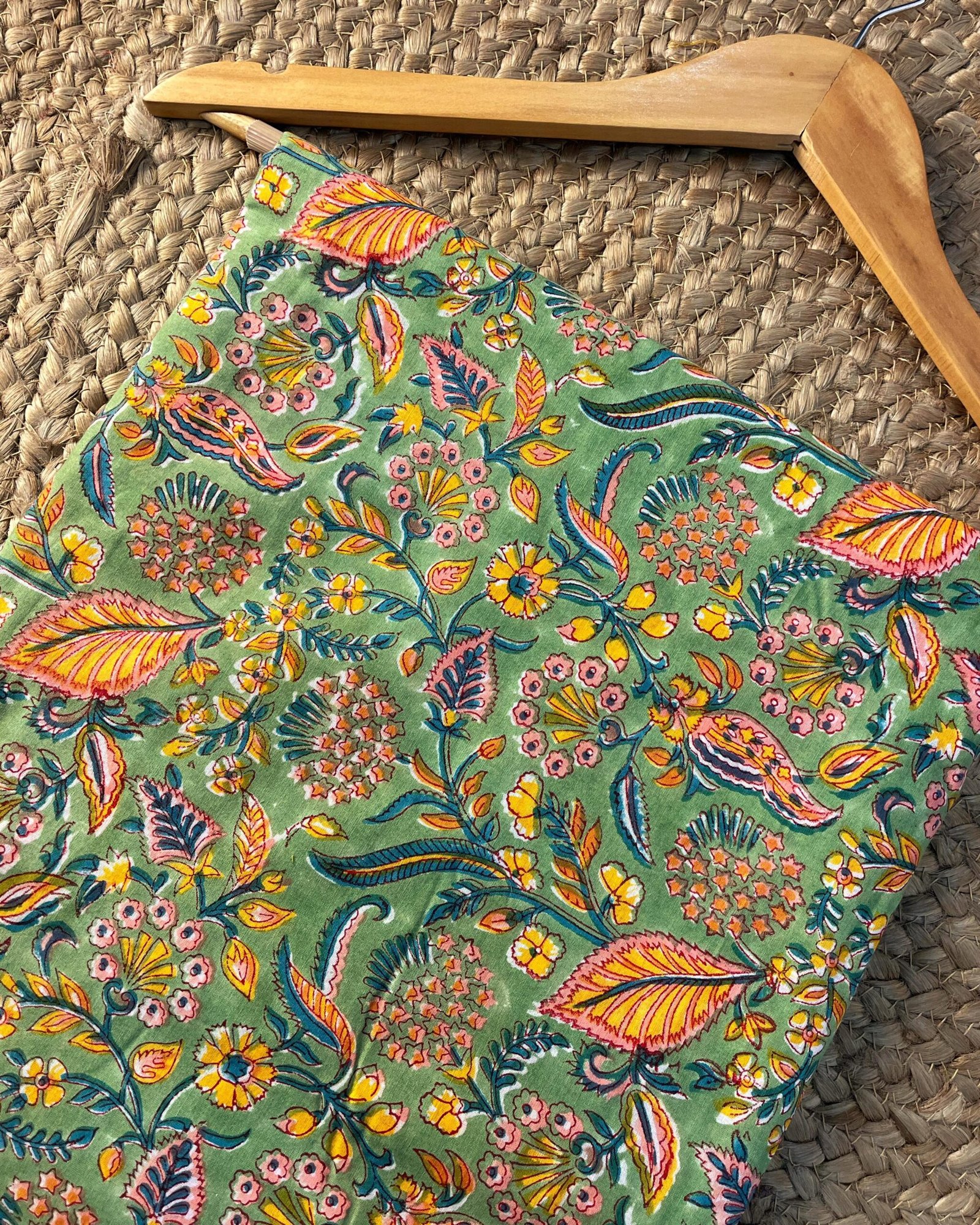 “Handcrafted from soft, breathable hand-block printed fabric, this kurti offers both comfort and style. The fabric is lightweight yet durable, perfect for customizing with your choice of neck, sleeve designs and length, allowing you to create a piece that’s truly yours.”