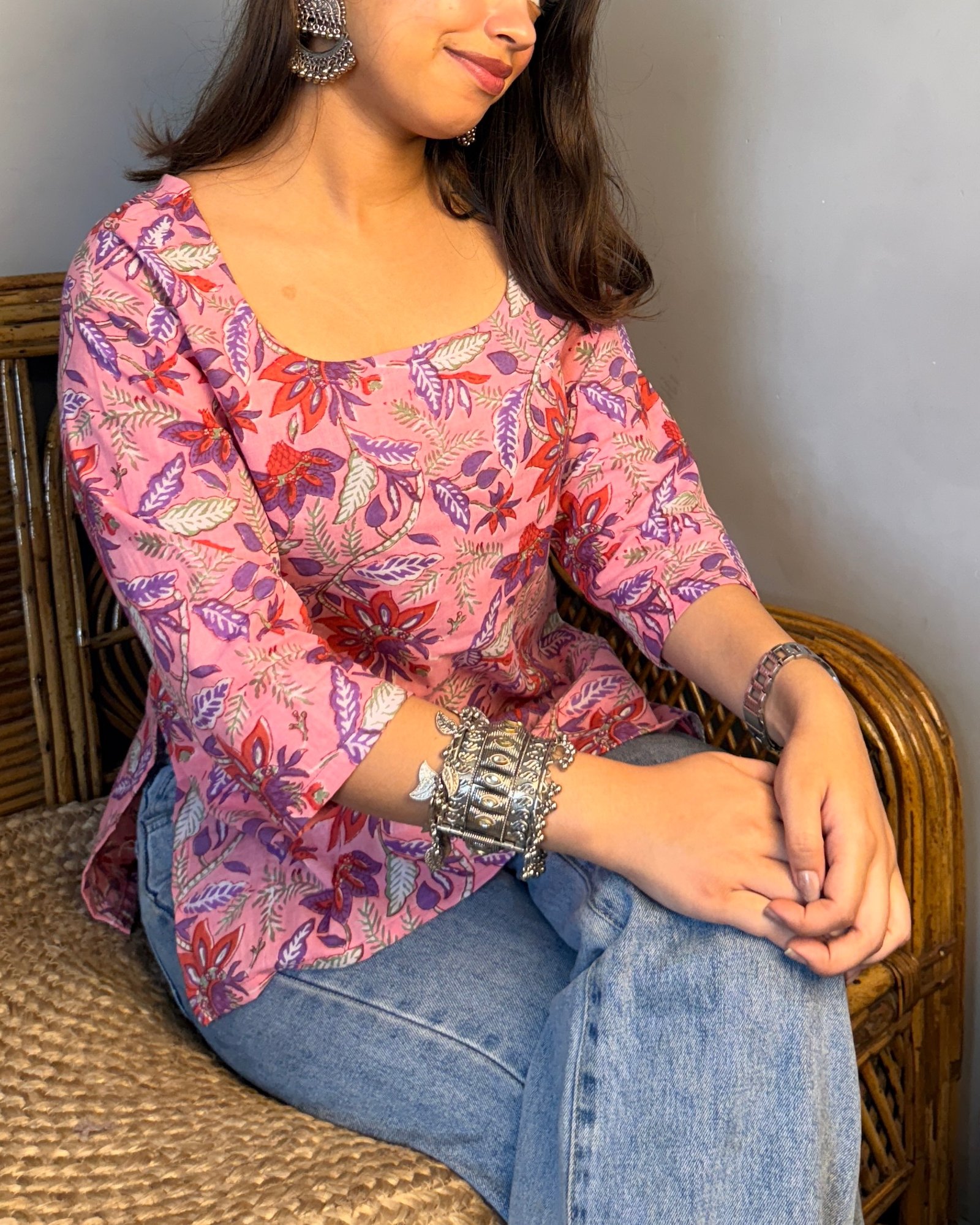 “Handcrafted from soft, breathable hand screen printed fabric, this kurti offers both comfort and style. The fabric is lightweight yet durable, perfect for customizing with your choice of neck, sleeve designs and length, allowing you to create a piece that’s truly yours.”