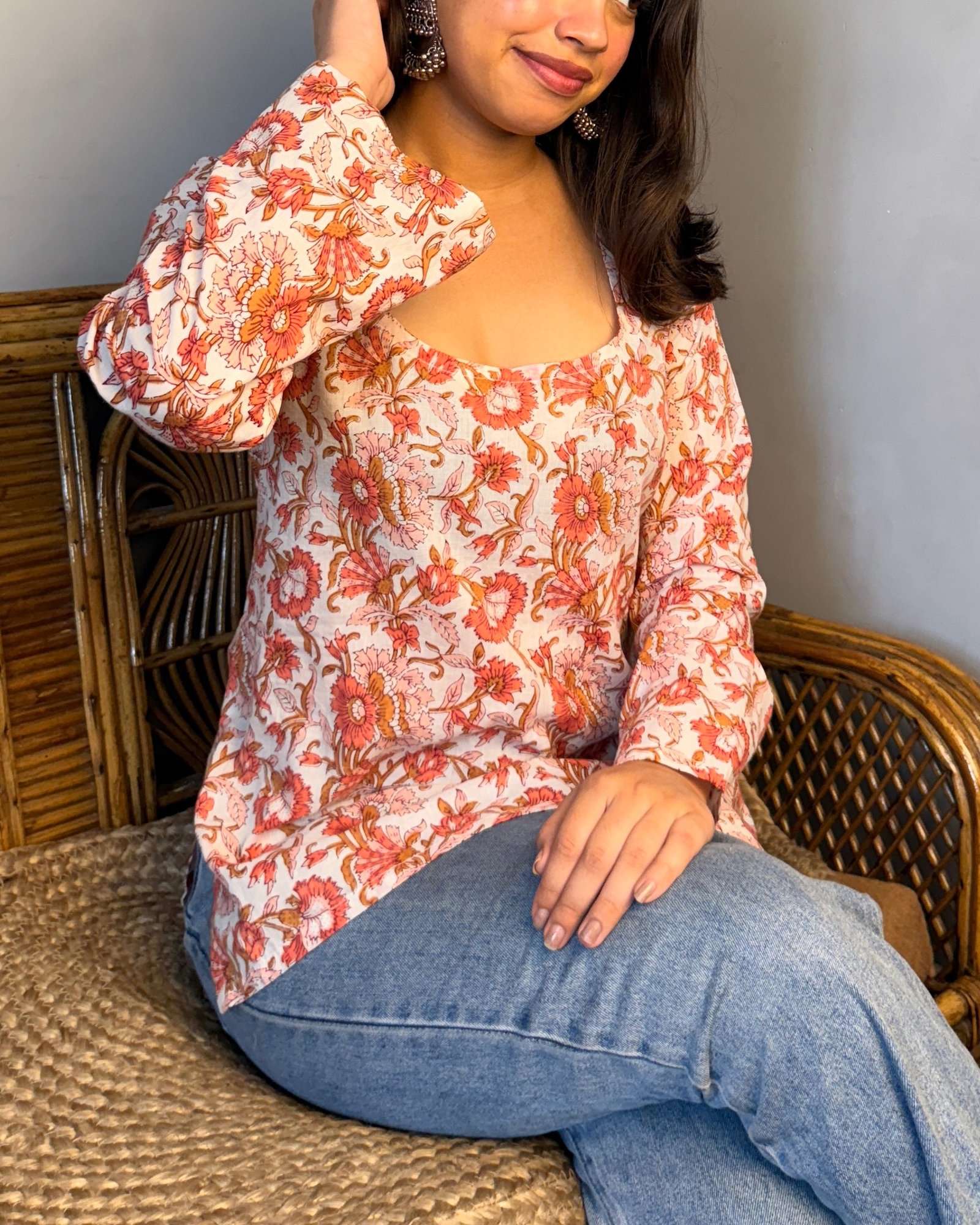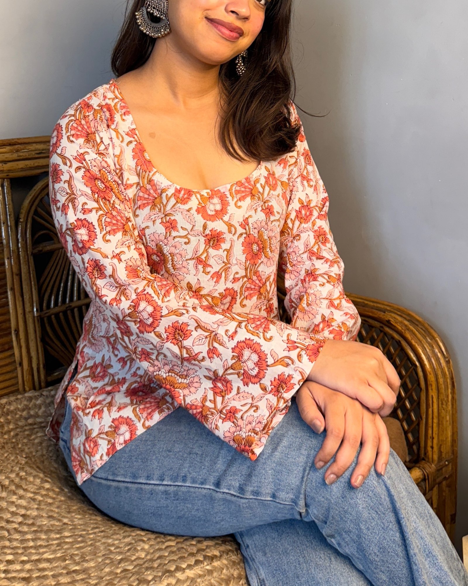 “Handcrafted from soft, breathable hand screen printed fabric, this kurti offers both comfort and style. The fabric is lightweight yet durable, perfect for customizing with your choice of neck, sleeve designs and length, allowing you to create a piece that’s truly yours.”